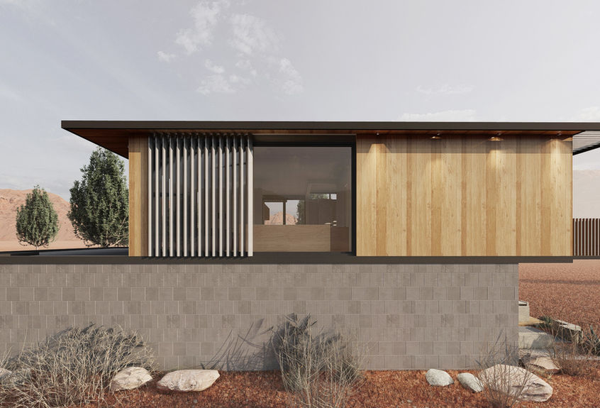 Het materiaalpalet van het huis is geïnspireerd op de woestijn zelf: aardse afwerkingen, houttexturen en verticale schermen zorgen voor warmte, tastbare rijkdom en een gevoel van bescherming. Zorgvuldig samengestelde daklijnen en architectonische schermen zorgen ervoor dat de hoogte binnen de perken blijft en bieden tegelijkertijd privacy ten opzichte van de buren.